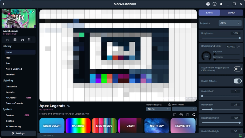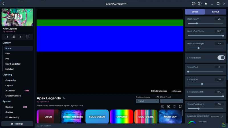 The SignalRGB Apex Legends integration allows you to display your health bar and shield bar anywhere on your device(s). Make sure the toggles labeled 'Enable HUD Effect' and is enabled.