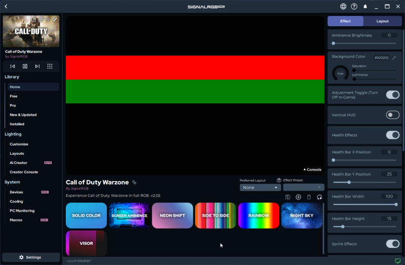 The SignalRGB COD Warzone integration allows you to display your health bar and sprint bar anywhere on your device(s). Make sure the toggle labeled 'Enable Hud Effects' is on.