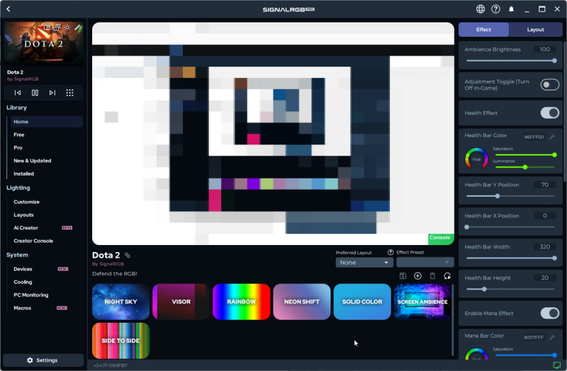 The SignalRGB DOTA 2 integration allows you to display your health bar and mana bar anywhere on your device(s). Make sure the toggle labeled 'Enable Hud Effects' is on.