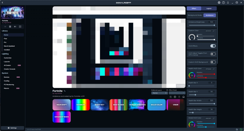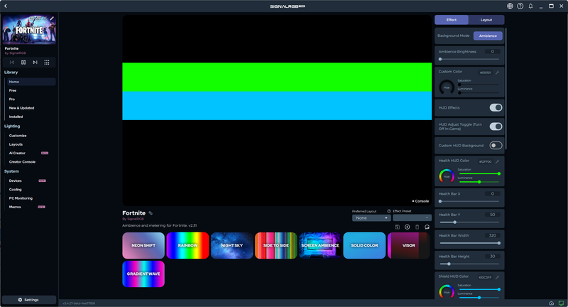 The SignalRGB Fortnite integration allows you to display your health bar and shield bar anywhere on your device(s). Make sure the toggle labeled 'Enable Hud Effects' is on.