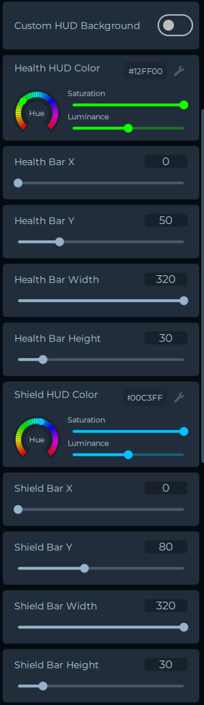 There are many settings to configure the health and shield bar. You can adjust the bar colors, the x and y positions of the bars, and the height and width of the bars.