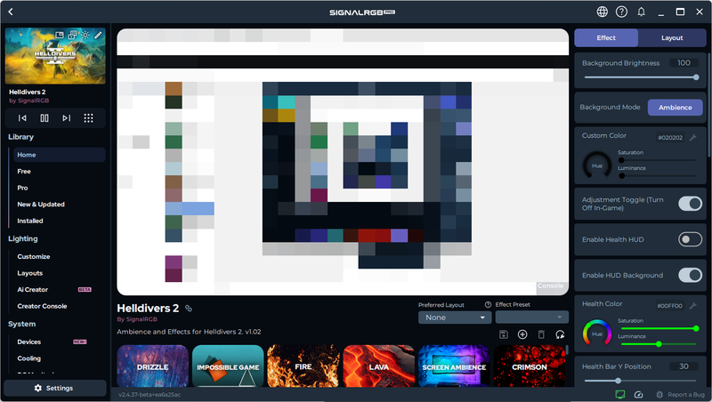 Go into your Helldivers 2 video settings and make sure that your display mode is set to Fullscreen or Borderless Window. Disable any color filters such as color blind mode if applicable. Your HUD scale needs to be set to it's default size (0.90) and most of your game interface settings need to be set to 'visible' to ensure that the integration will function properly because SignalRGB scans the game interface in order to trigger effects.