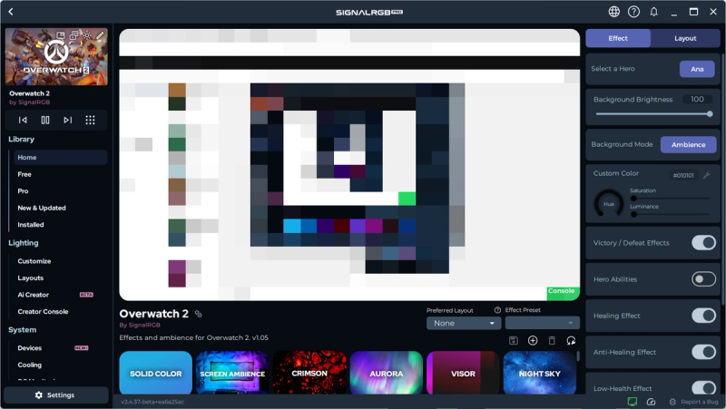 Now you can go to 'Customize' on the left side of the window and you will see a bunch of settings associated with the Overwatch 2 integration. By default, every integration starts with screen ambience as the background and it will look like the image below.