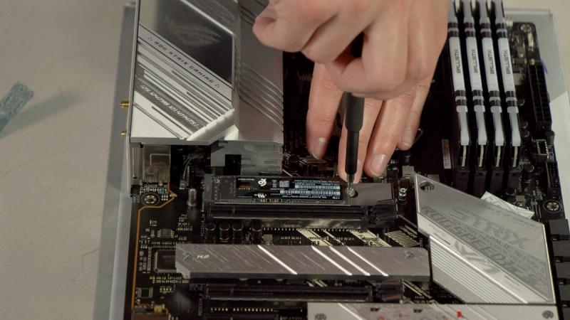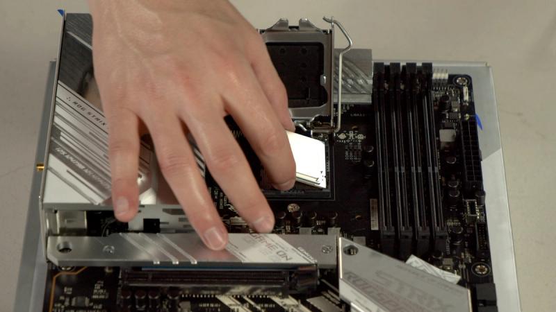 Most modern motherboards have a heat-sink over the SSD slot so you have to unscrew that first, then make sure to peel the film off of the thermal pads before installing the SSD. Then you kind of just insert your SSD into the pins at a slight angle, push down, and screw it in.