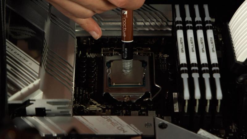 When it comes to thermal paste, all you need is a small dot in the middle of the processor. Then place the pump on top and move it around slightly to spread the thermal paste.