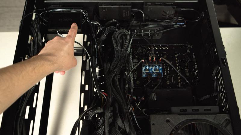 Now you can go ahead and install any RGB controllers that you'll need. I skipped ahead here and while it started off really strong, I gave up trying to cable manage all the sata connectors so I just shoved them like this, consider this a more realistic guide that shows you the ugly side of RGB PC building. I'm using 6 RGB controllers, the Lian Li Strimer plus controller, the Commander Core controller which is required for the Corsair AIO, the Razer ARGB controller, and 3 Lian Li Infinity Fan Controllers.