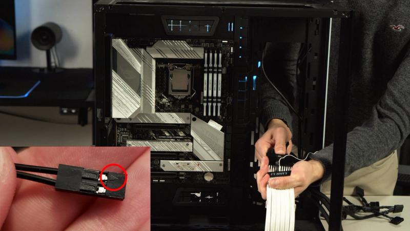 After installing the power supply, connect all of the important cables to the motherboard like the 24 pin cable, the cpu cable, the front panel connectors, and the hd audio cable. Except in this situation Iāll be connecting the 24 pin cable and the gpu cable to the lian li strimers. If you don't know how to connect the front panel connectors then refer to the manual, a little tip from me is that there's a little triangle on the reset and power switch connectors that indicates plus and the side without the triangle is minus.