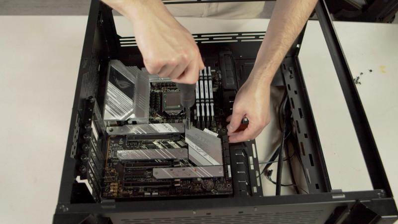 Next, prepare the motherboard by installing the CPU, RAM, SSD, and the backplate for the liquid cooler. You'll want to take out the tiny screw and stand off that's included in the box because you're going to need that to screw in the SSD later. Some motherboards like this one already have the stand off prepared for you though so it just depends on what motherboard you have.