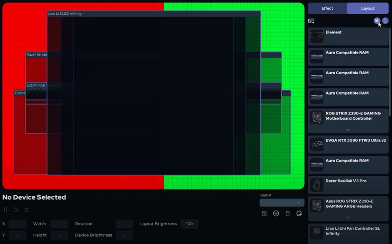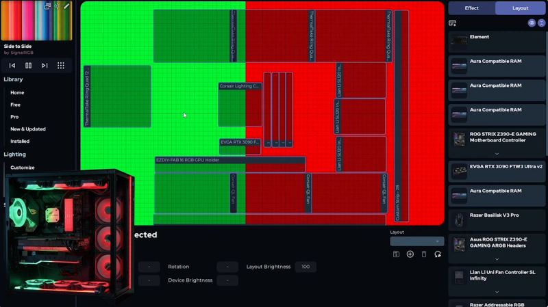 This next part will take you some time but it is totally worth it! SignalRGB Layouts allows you to control the positioning of your devices on a 'canvas' to make effects flow from one device to another anyway you want. The most common way of setting up the layout is by matching the overall real positions of the devices in your setup. The easiest way to get this done is by using an effect called 'Side to Side'. This effect will act as your reference so that you know if you are laying everything out correctly.