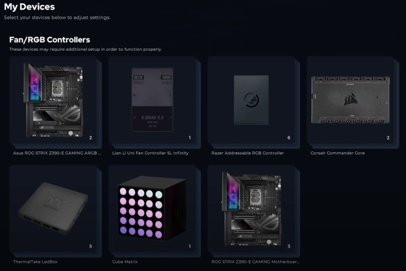Click on the Devices tab located under the System category. On the devices page you will find all of your RGB devices that are supported by SignalRGB. Peripherals such as keyboards and mice do not need any additional configuration. However, RGB controllers and motherboard headers will need to be configured manually so that SignalRGB knows which components you have connected to them such as RGB fans, strips, water blocks, case lighting, etc...